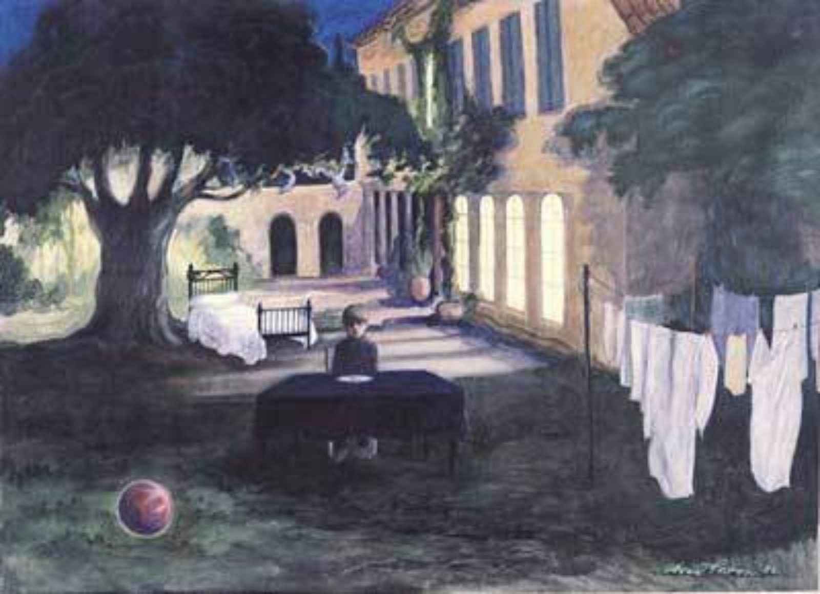 In 1982, during a three month tour of France, the artist's six year old son was obliged to spend his first night apart from her. Left in the care of a homeopathic doctor, a freind of the family, he spent a most unhappy night. The least of his miseries was a plate of tomatoes he could not eat followed by a very early bed and a cold shower in the morning. This painting is based on his experience.